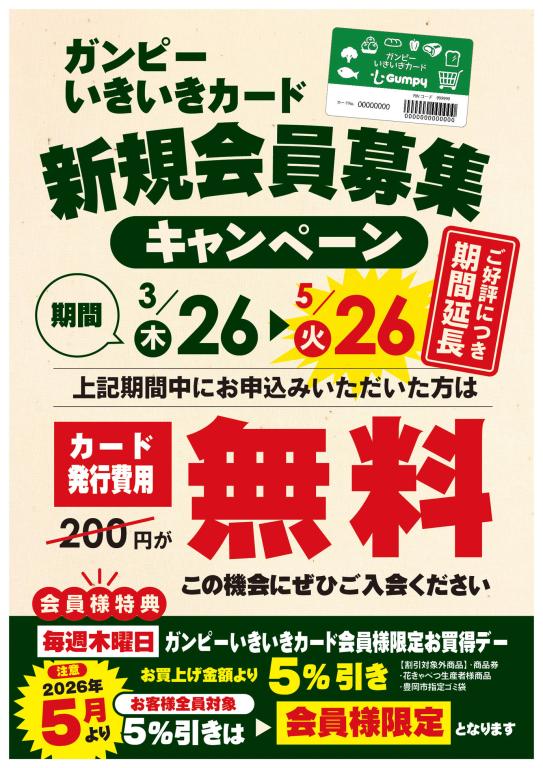 只今、ご好評いただいております、毎週木曜日のお客様全員対象のお買い上げ金額より5%引きのお買得デーは、5月より、ガンピーいきいきカード会員様限定のお買得デーと変更