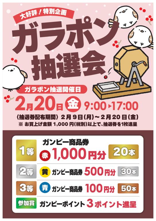 今月も大好評 特別企画 “ガラポン抽選会”を開催いたします!今月のガラポン抽選会開催日は、1月16日(金)9:00~17:00