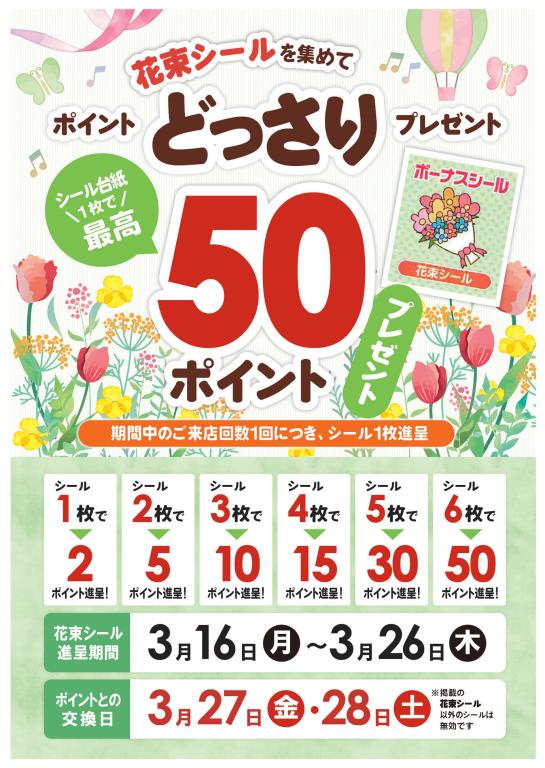 本日(3月16日)から、大好評のシールラリー「花束シールを集めて、ポイントどっさりプレゼント」企画が始まります!