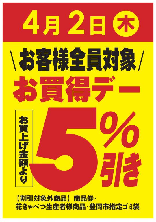 4月2日 木曜日【お客様全員対象】 “お買得デー” を開催いたします!