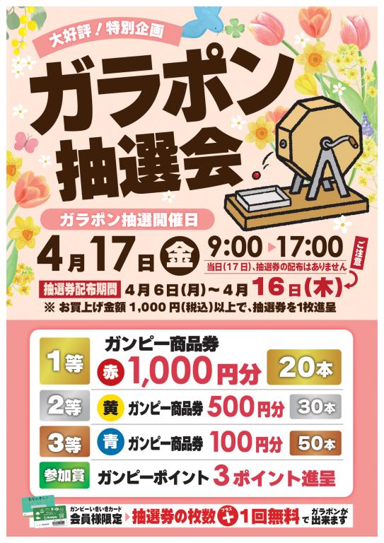 今月も大好評 特別企画 “ガラポン抽選会”を開催いたします!今月のガラポン抽選会開催日は、3月13日(金)9:00~17:00