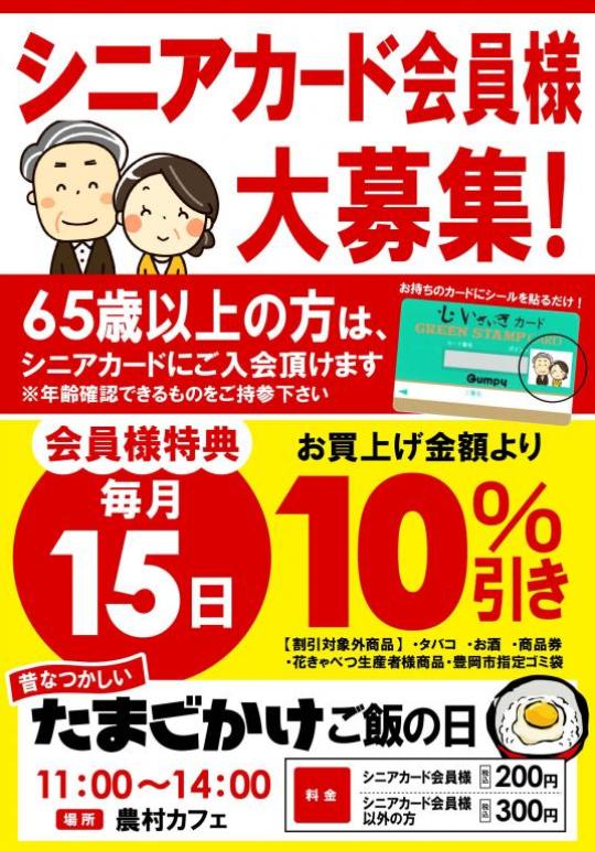 会員様特典といたしまして、毎月15日、①お買上げ金額より10%引き(割引対象外商品)・タバコ・お酒・商品券・花きゃべつ生産者様商品・豊岡市指定ごみ袋 ②たまごかけご飯の日〈時間〉11:00~14:00〈場所〉農村カフェ シニアカード会員様価格 税込200円でお召し上がりいただけます。※シニアカード会員様以外は、税込300円とさせていただきます。