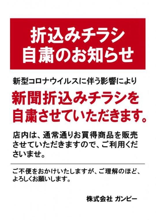 本日(5/8)の折込みチラシをもちまして、当面の間、新聞折込みのチラシを自粛させていただきます。