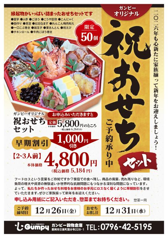 2026年も心新たに家族揃って新年をお迎えしましょう!只今、ガンピーオリジナル祝おせちセット(2~3人前)のご予約を承っております。