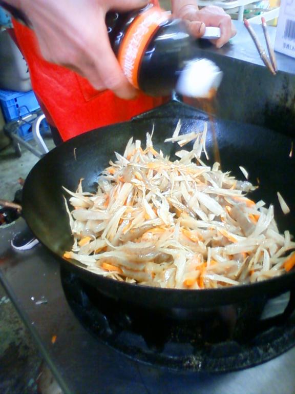 - ごぼうがしんなりしてきたら、酒を入れ1分くらい炒めてから調味料を入れます。