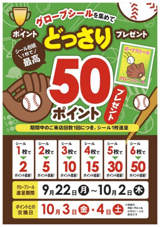 ポイントとの交換日は、10/3(金)・4(土)の2日間限定です。交換日が過ぎますと、ポイント進呈はできませんのでご注意ください。※掲載のグローブシール以外のシールは無効です。