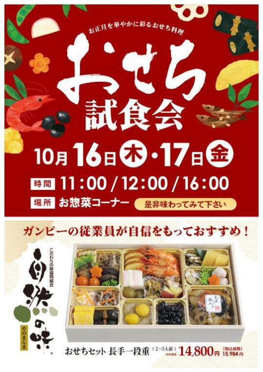 おせちのご予約受付を開始しましたので、それにともない、おせちの試食会を開催いたします!【日時】10月16日(木)、17日(金)11:00 / 12:00 / 16:00【場所】お惣菜コーナー