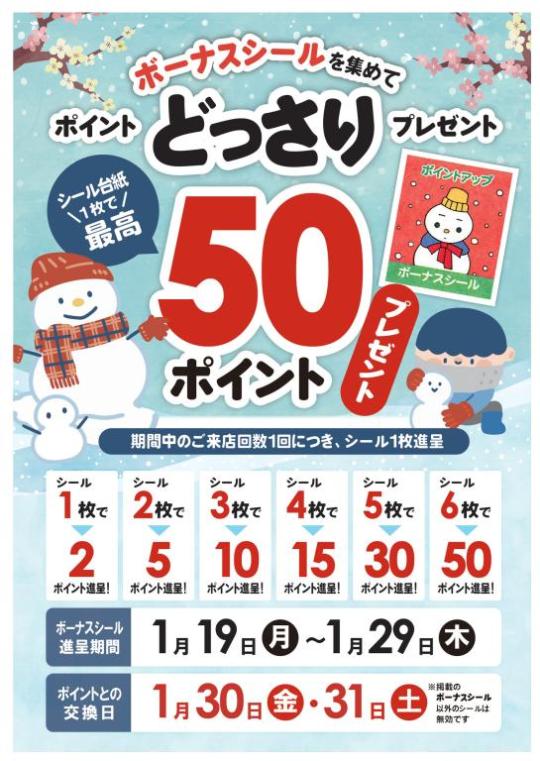 本日(1月19日)から、大好評のシールラリー「ボーナスシールを集めて、ポイントどっさりプレゼント」企画が始まります!