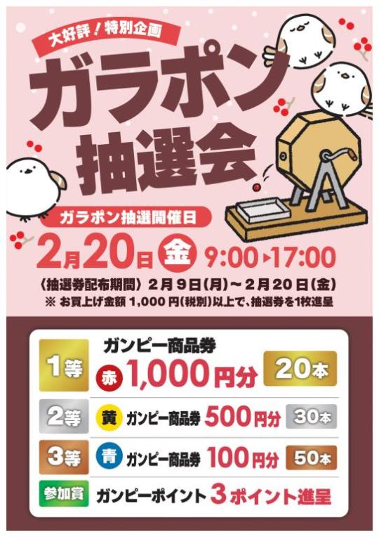 今月のガラポン抽選会開催日は、2月20日(金)9:00~17:00
