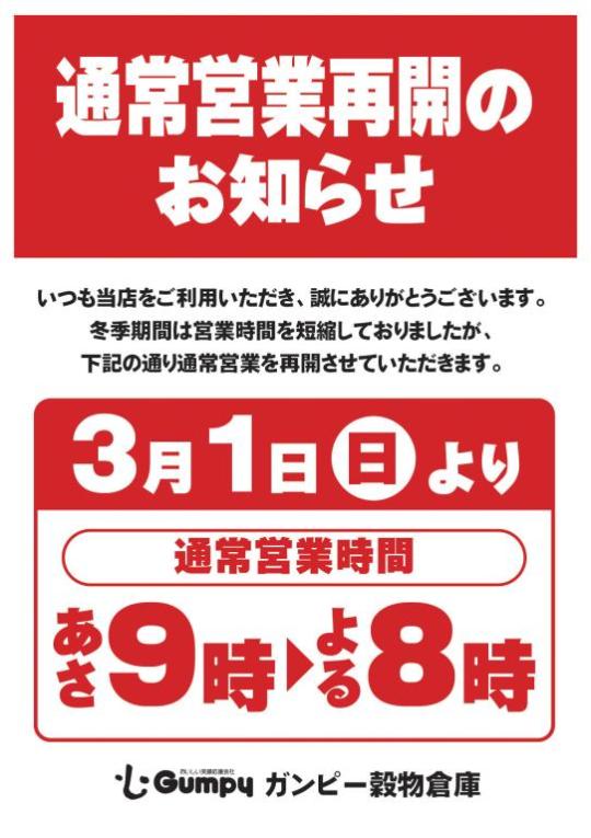 3月1日(日)より営業時間/朝9:00〜夜8:00
